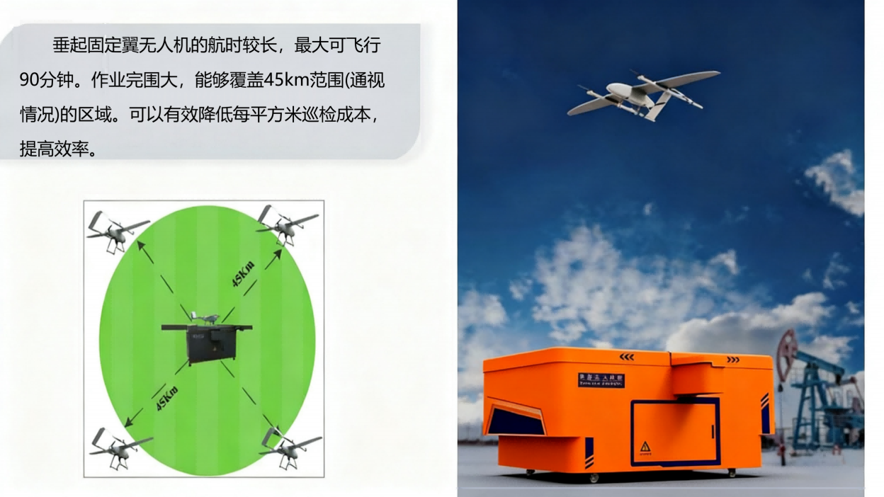 使用一架无人机搭配多个停机舱,在机舱之间全自主起降、自动充电、全天候执行飞行任务,实现一机多舱连续作业模式,适用于直线距离较长的线状巡检场景。